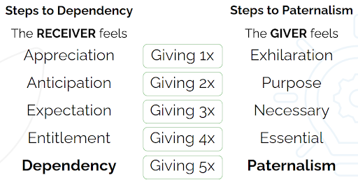 Without these practical safeguards, Lupton warns of 5 downward steps to dependency: Appreciation, Anticipation, Expectation, Entitlement, and Dependency. Knowing the danger of repetitive, one-way giving assists charity workers to understand that they are often part of keeping individuals trapped in poverty and dependent on systems.